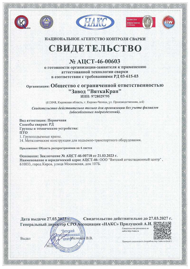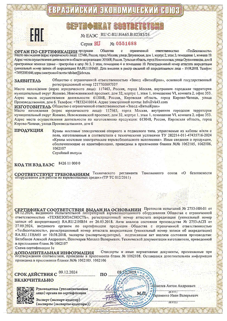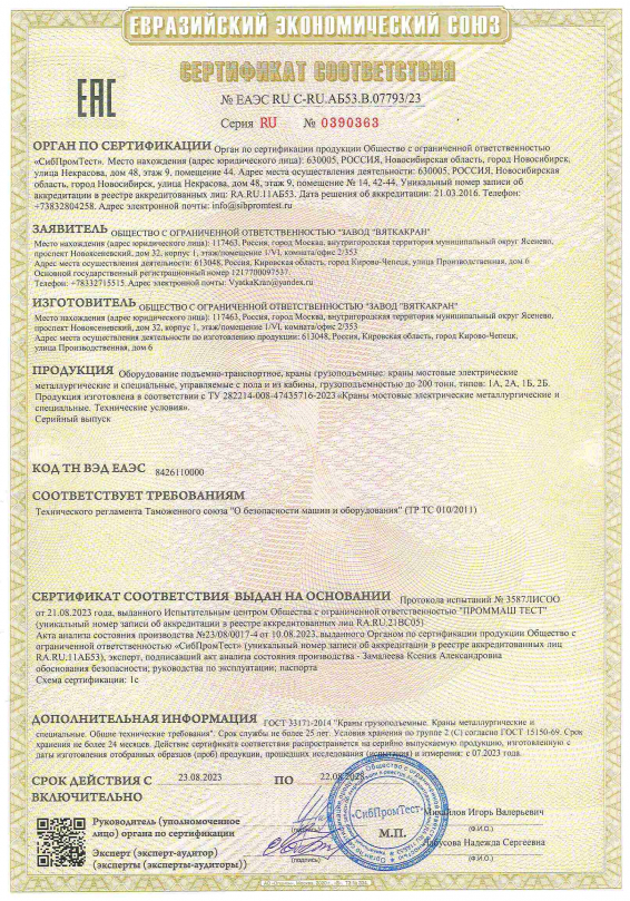 Сертификат краны мостовые ВБИ