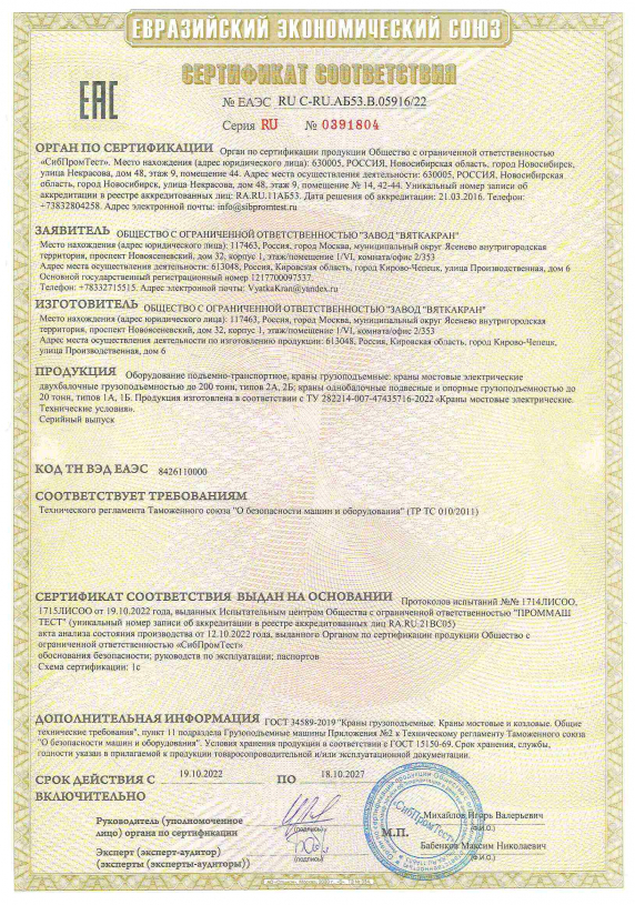 Сертификат краны мостовые ВБИ